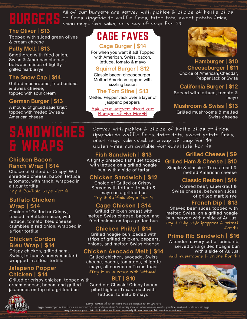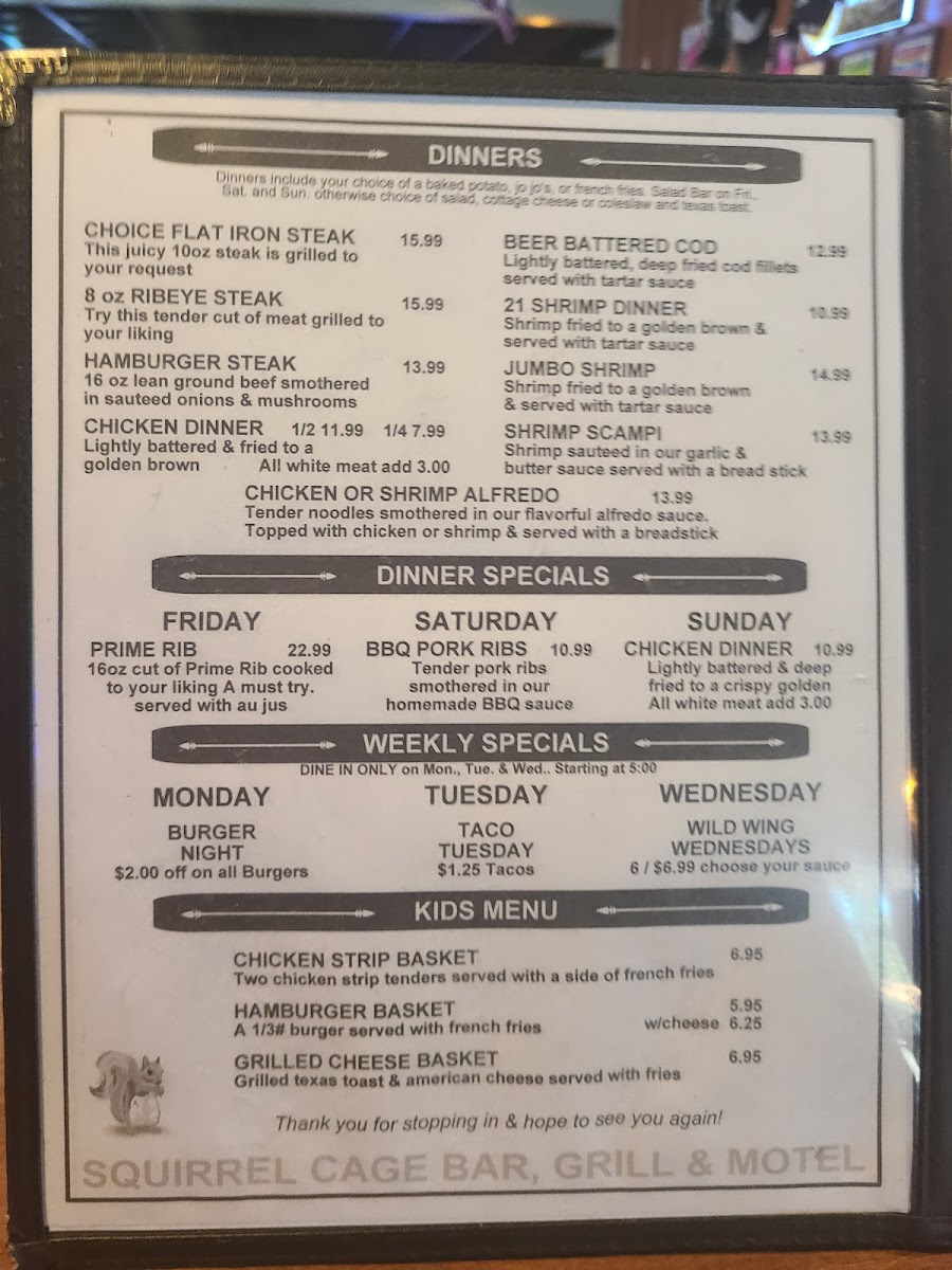 Welcome to Squirrel Cage Bar Grill & Motel, a cozy gem located at 8144 Hwy 61, Willow River, MN. This inviting establishment offers an impressive menu that caters to all palates. From mouthwatering smash burgers and German burgers to delightful chicken avocado wraps, every dish is crafted with care.